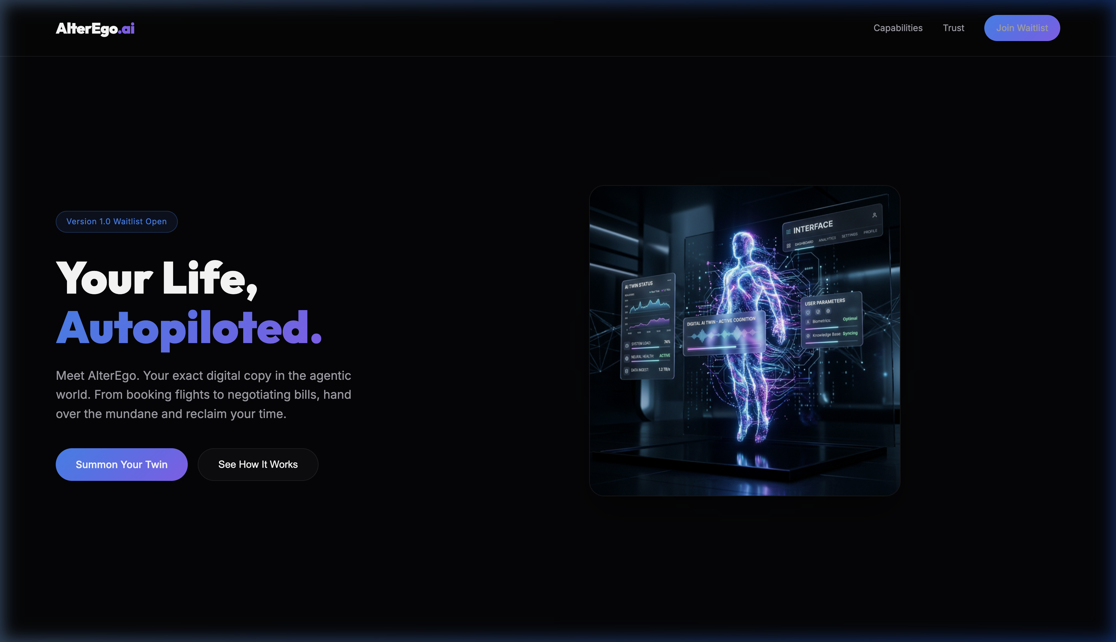 An exact digital copy acting as an autonomous agent. Designed from a product-first perspective to mitigate cognitive load by automating financial, travel, and support tasks.